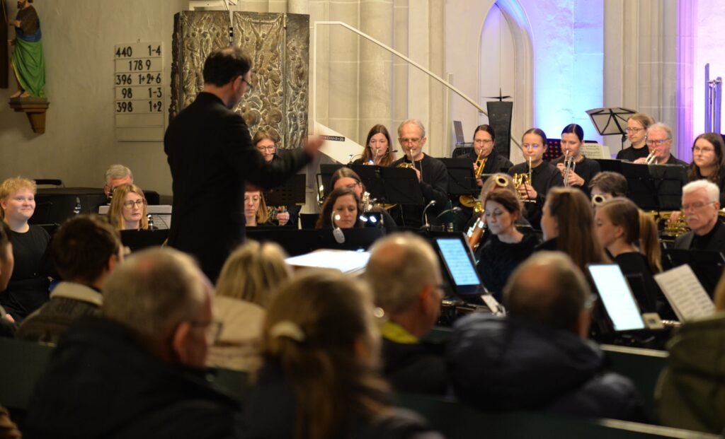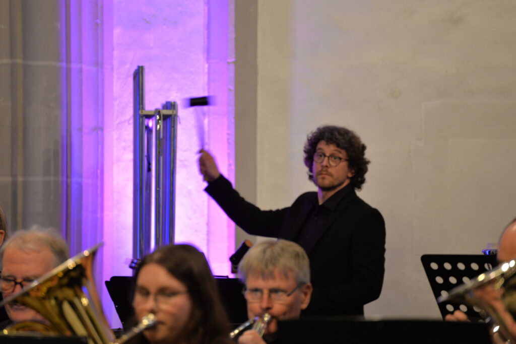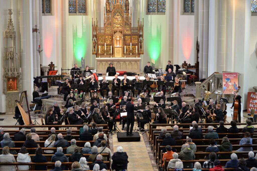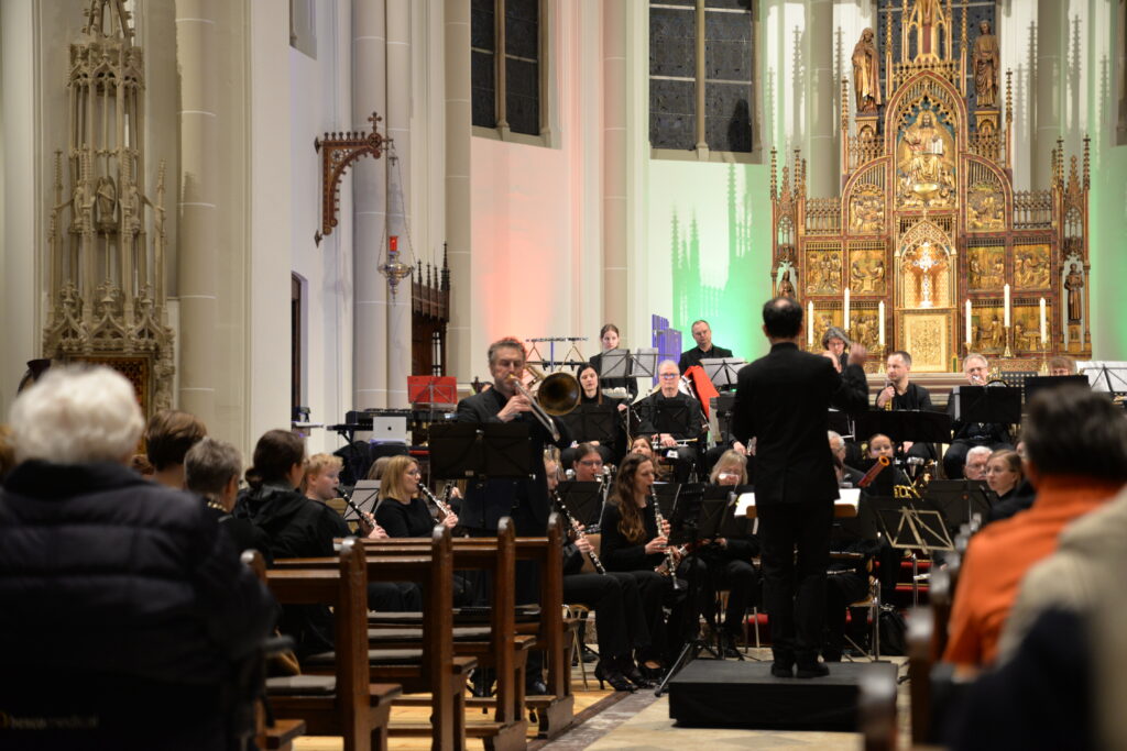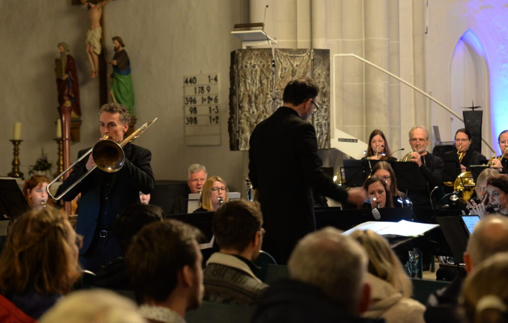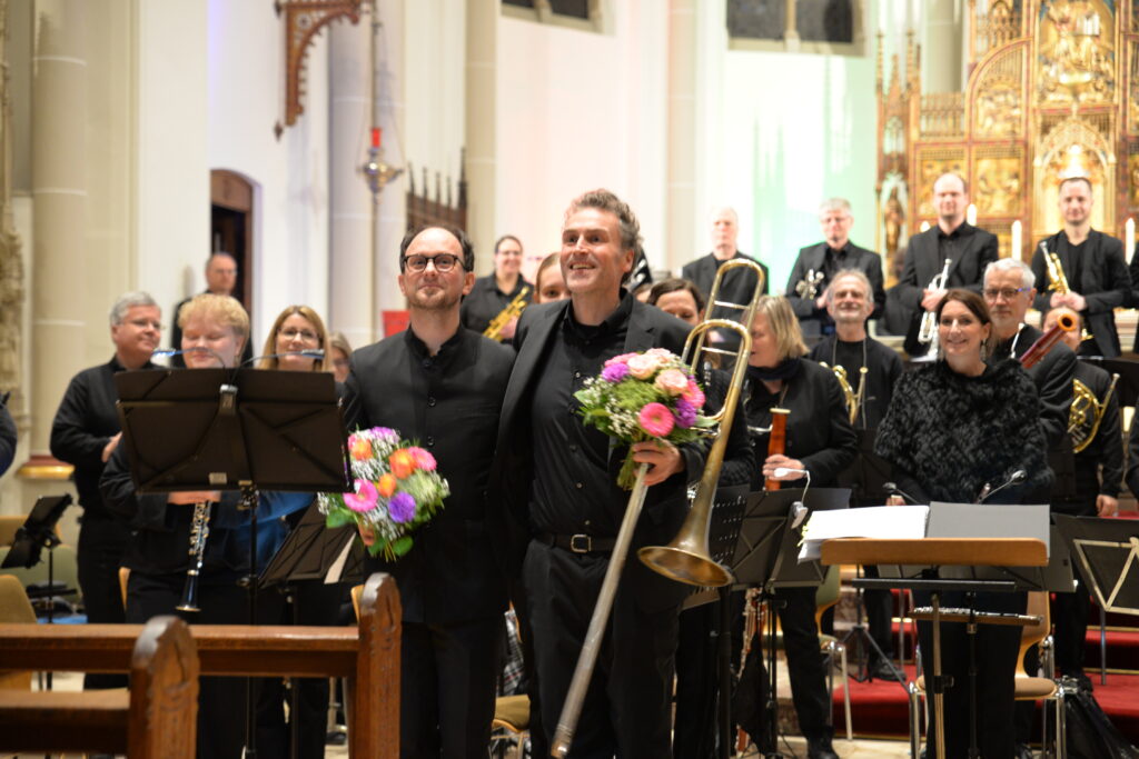 Das Hauptwerk des Programms bildete Bert Appermonts zeitgenössisches Posaunenkonzert Colors mit dem Solisten Martin Räpple (Osnabrücker Sinfonieorchester). Wenn zuvor in Thorsten Wollmanns Komposition Aquarell Charakteristika des gleichnamigen malerischen Stils musikalisch nachgestaltet werden, so entspricht im anspruchsvollen Solokonzert jede Farbe (gelb, rot, blau und grün) einem typischen musikalischen Charakter.